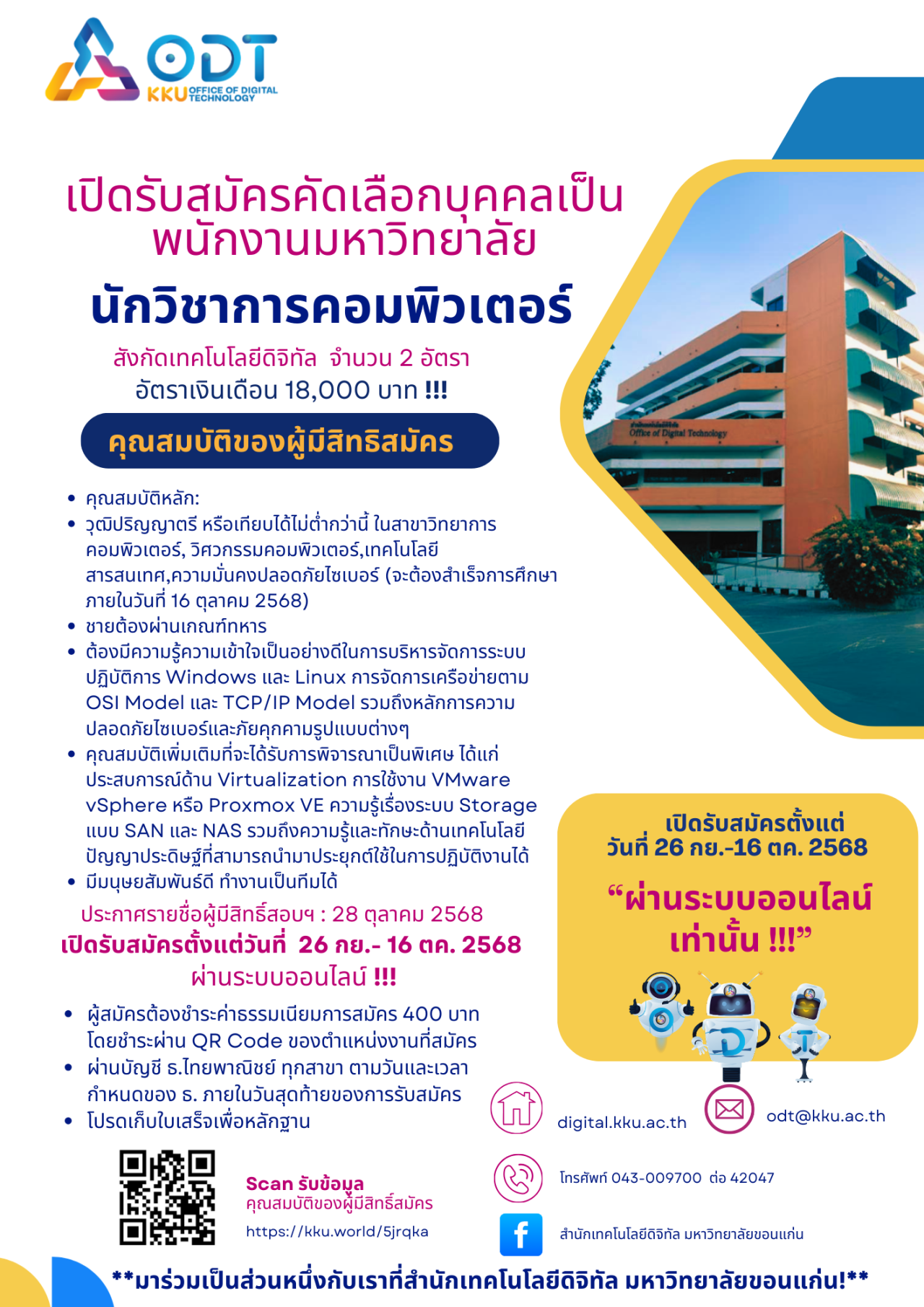 สำนักงานเทคโนโลยีดิจิทัล มหาวิทยาลัยขอนแก่น เปิดรับสมัครบุคคลเข้ารับการคัดเลือกเป็น พนักงานมหาวิทยาลัย ตำแหน่ง นักวิชาการคอมพิวเตอร์ จำนวน 2 อัตรา
