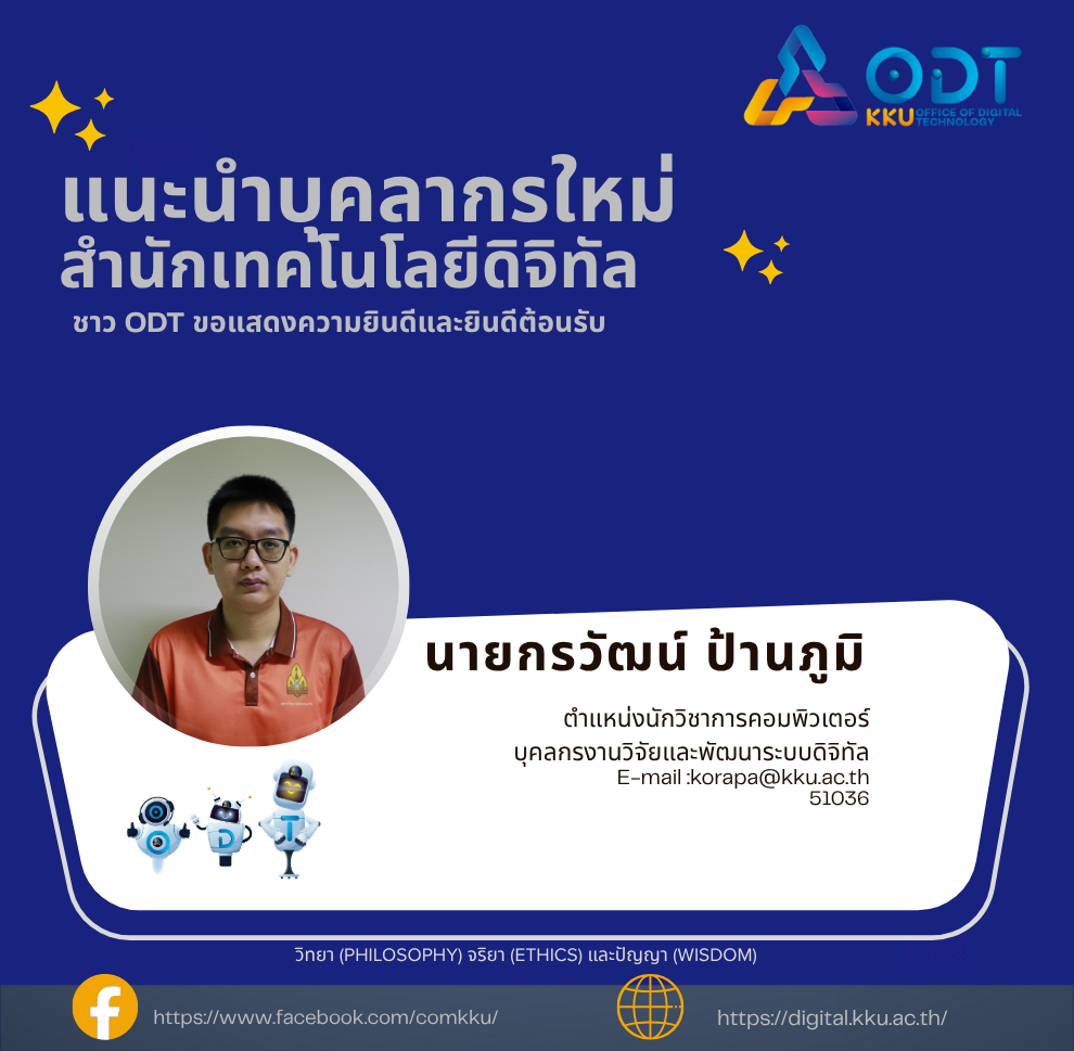 แนะนำบุคลากรใหม่สำนักเทคโนโลยีดิจิทัล นายกรวัฒน์ ป้านภูมิ ตำแหน่งนักวิชาการคอมพิวเตอร์